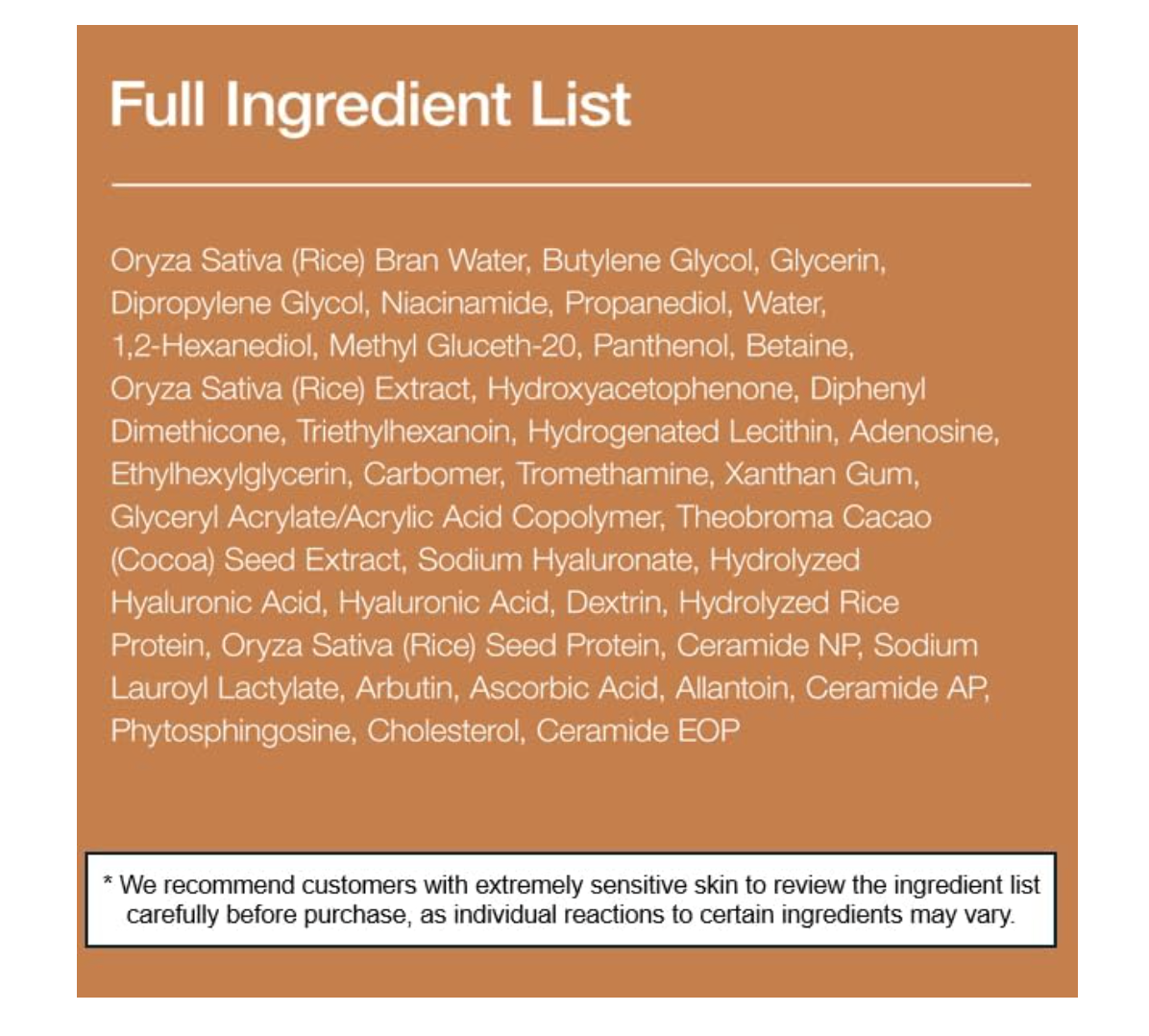 Oryza Sativa (rice) bran water (71%), butylene glycol, glycerin. Dipropylene glycol, niacinamide, propanediol, water, 1,2-hexanediol, methylgluceth-20, panthenol, betaine, oryza sativa (rice) extract (3,753 ppm), hydroxyacetophenone, diphenyl dime thicone, triethylhexanoin, hydrogenated lecithin, adenosine. Ethylhexylglycerin, carbomer, tromethamine, xanthan gum. Glyceryl Acrylate/Acrylic Acid Copolymer, Theobroma Cacao (Cocoa) Seed Extract, Sodium Hyaluronate, Hydrolyzed Hyaluronic Acid, Hyaluronic Acid, Dextrin, Hydrolyzed Rice Protein (3,000ppb), Oryza Sativa (Rice) Seed Protein (3,000ppb), Ceramide NP, Sodium Lauroyi Lactylate, Arbutin, . corcorcor. Bic acid, allana. toin, ceramide AP, phytosphingosine, cholesterol, ceramide EOP