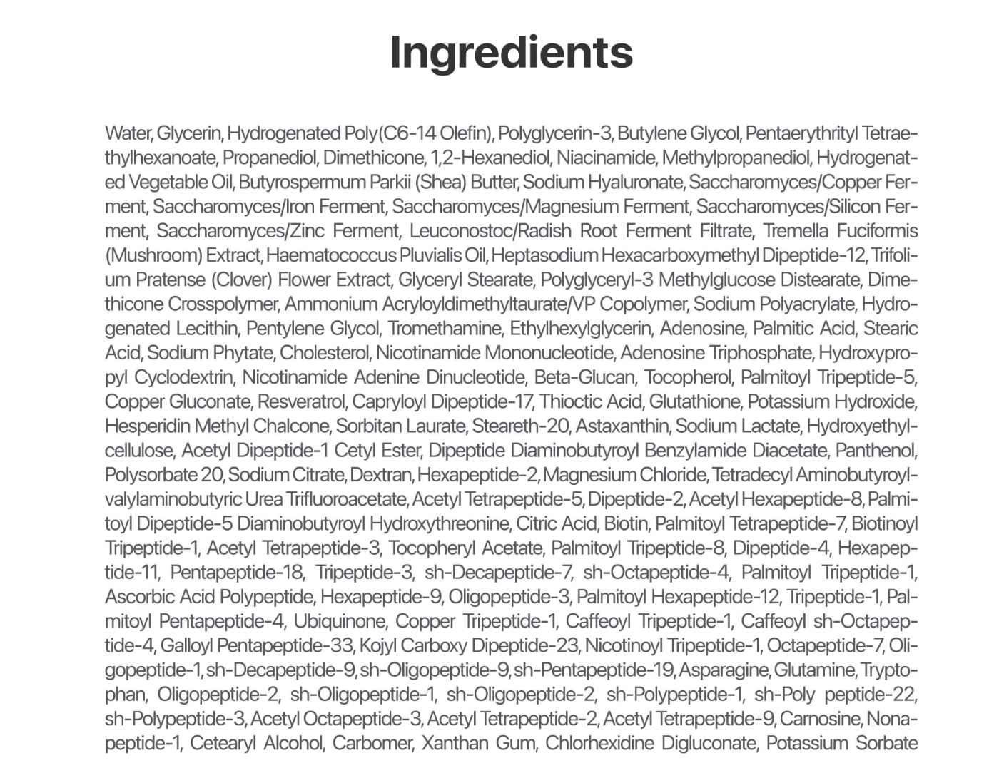 Water; Glycerin; Hydrogenated Poly(C6-14 Olefin); Polyglycerin-3; Butylene Glycol; Pentaerythrityl Tetraethylhexanoate; Propanediol; Dimethicone; 1, 2-Hexanediol; Niacinamide; Methylpropanediol; Cetearyl Alcohol; Glyceryl Stearate; Hydrogenated Vegetable Oil; Polyglyceryl-3 Methylglucose Distearate; Butyrospermum Parkii (Shea) Butter; Dimethicone Crosspolymer; Ammonium Acryloyldimethyltaurate/VP Copolymer; Sodium Polyacrylate; Hydrogenated Lecithin; Carbomer; Xanthan Gum; Pentylene Glycol; Tromethamine; Ethylhexylglycerin; Adenosine; Palmitic Acid; Stearic Acid; Sodium Phytate; Cholesterol; Sodium Hyaluronate; Adenosine Triphosphate; Hydroxypropyl Cyclodextrin; Nicotinamide Adenine Dinucleotide; Beta-Glucan; Tocopherol; Palmitoyl Tripeptide-5; Copper Gluconate; Saccharomyces/Copper Ferment; Saccharomyces/Iron Ferment; Saccharomyces/Magnesium Ferment; Saccharomyces/Silicon Ferment; Saccharomyces/Zinc Ferment; Resveratrol; Capryloyl Dipeptide-17; Thioctic Acid; Leuconostoc/Radish Root Ferment Filtrate; Glutathione; Tremella Fuciformis (Mushroom) Extract; Haematococcus Pluvialis Oil; Potassium Hydroxide; Hesperidin Methyl Chalcone; Sorbitan Laurate; Steareth-20; Astaxanthin; Sodium Lactate; Hydroxyethylcellulose; Acetyl Dipeptide-1 Cetyl Ester; Dipeptide Diaminobutyroyl Benzylamide Diacetate; Heptasodium Hexacarboxymethyl Dipeptide-12; Panthenol; Polysorbate 20; Sodium Citrate; Chlorhexidine Digluconate; Dextran; Hexapeptide-2; Magnesium Chloride; Tetradecyl Aminobutyroylvalylaminobutyric Urea Trifluoroacetate; Acetyl Tetrapeptide-5; Dipeptide-2; Potassium Sorbate; Acetyl Hexapeptide-8; Palmitoyl Dipeptide-5 Diaminobutyroyl Hydroxythreonine; Citric Acid; Biotin; Palmitoyl Tetrapeptide-7; Biotinoyl Tripeptide-1; Acetyl Tetrapeptide-3; Trifolium Pratense (Clover) Flower Extract; Tocopheryl Acetate; Palmitoyl Tripeptide-8; Dipeptide-4; Hexapeptide-11; Pentapeptide-18; Tripeptide-3; sh-Decapeptide-7; sh-Octapeptide-4; Palmitoyl Tripeptide-1; Ascorbic Acid Polypeptide; Hexapeptide-9; Oligopeptide-3; Palm